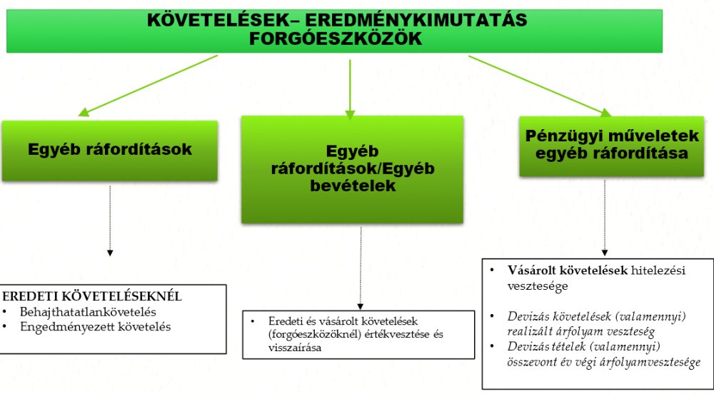 A következő ábra összefoglalja a forgóeszközök és befektetett eszközök közé sorolt követelések főbb gazdasági eseményének eredménykimutatásban való besorolási szempontjait.