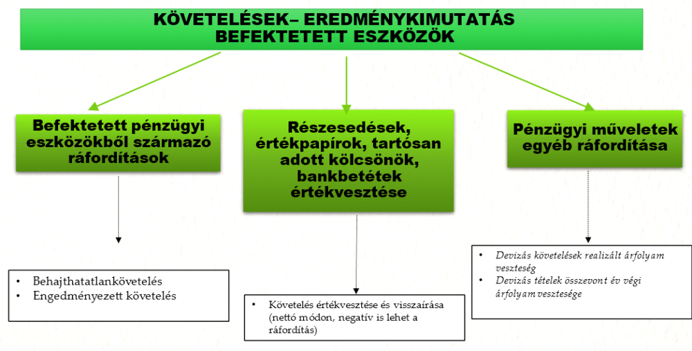 A befektetett pénzügyi eszközök között kimutatott követelések értékvesztését a pénzügyi műveletek ráfordításaként, ezen belül a részesedések, értékpapírok, tartósan adott kölcsönök, bankbetétek értékvesztéseként, míg a forgóeszközök közé besorolt követelések értékvesztését egyéb ráfordításként kell elszámolni.